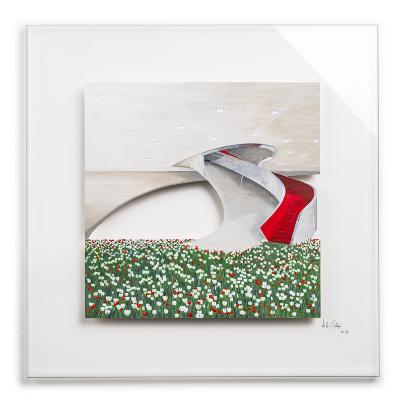 In der Serie "Architektur trifft Natur" sind faszinierende, reale Architekturwelten - oftmals in Kombination mit großen, üppigen und farbenprächtigen Blumenwiesen - zwischen Realität und Fantasie zu sehen...
